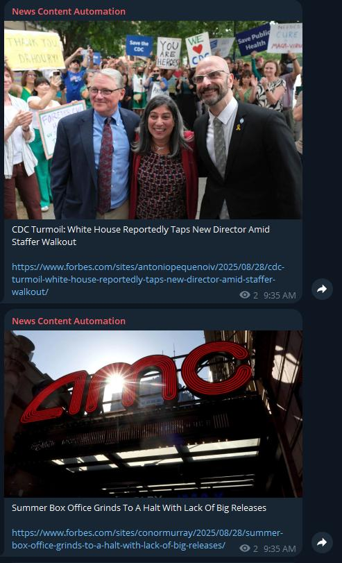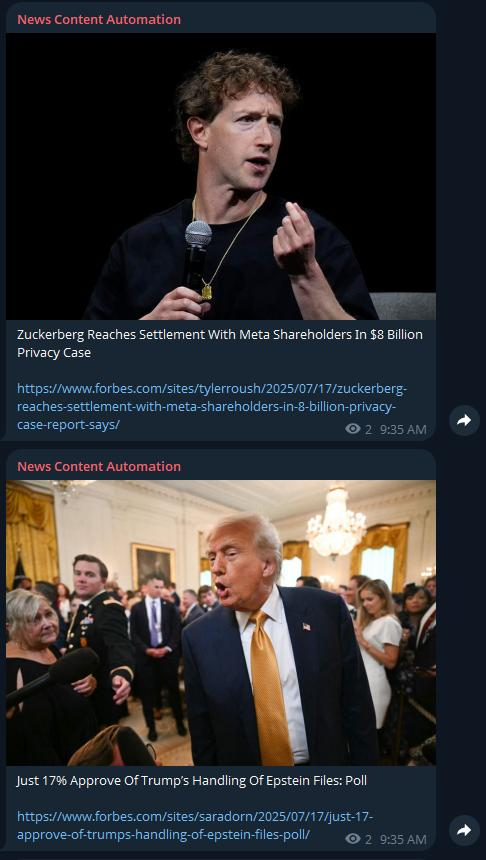 - Finally, the filtered news articles are sent as rich media messages to Telegram, including the headline, a picture, and a link.