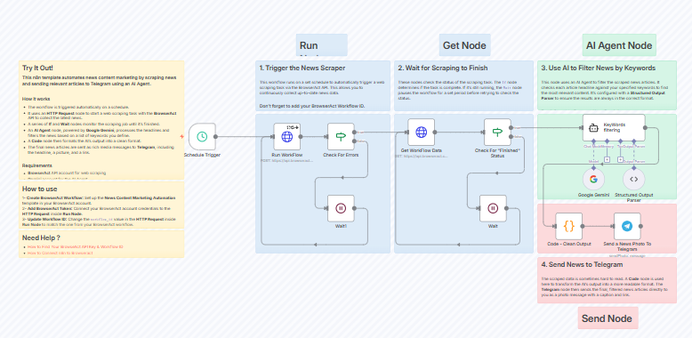 In the age of information overload, manually tracking relevant news has become nearly impossible. This guide introduces an AI‑powered news automation workflow built with n8n, BrowserAct, and Gemini AI. It automatically collects, filters, and delivers high‑relevance news updates in real time — straight to Telegram or your preferred workspace. Perfect for marketers, journalists, researchers, and developers, the workflow helps teams save time, reduce noise, and make faster, data‑driven decisions.