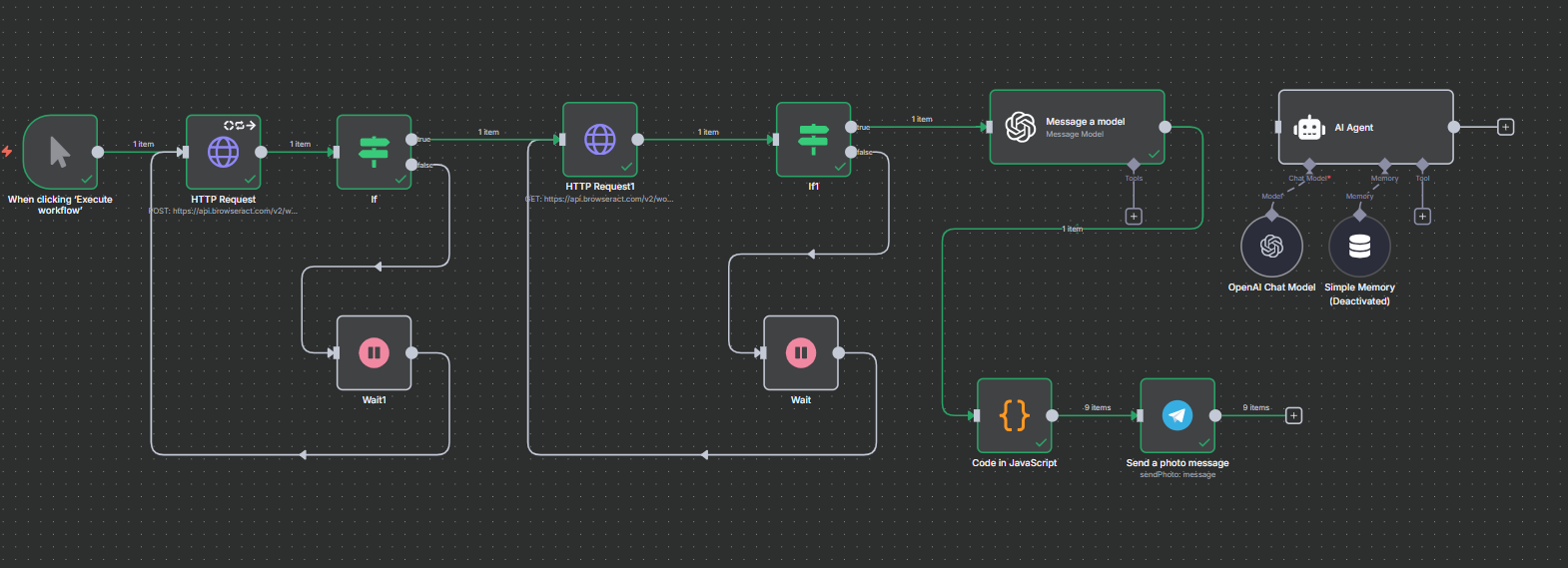- A series of If and Wait nodes monitor the scraping job until the full data is ready.