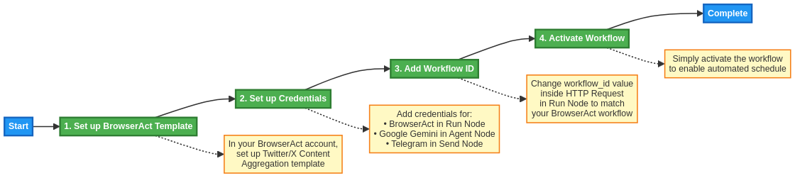 The Automate Social Media Content Aggregation to a Telegram Channel template is an end‑to‑end automation built with n8n and BrowserAct. It continuously collects and summarizes posts from your Twitter/X Home page (or other social platforms), then delivers curated updates straight to your Telegram channel.