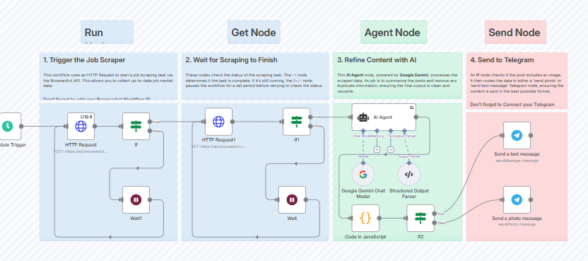 - Set up Credentials: Add your credentials for BrowserAct In Run Node , Google Gemini in Agent Node, and Telegram in Send Node.