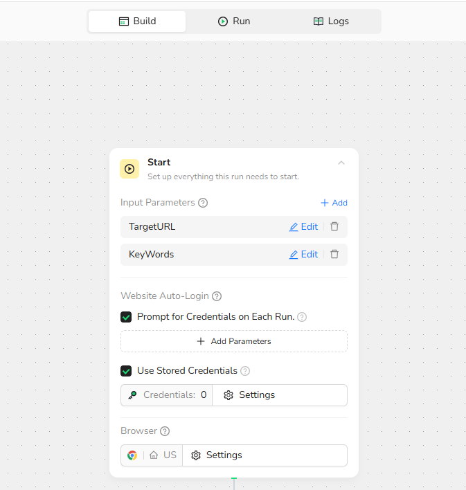 - Set up Ketwords parameter: e.g., "BrowserAct"