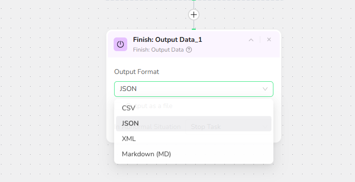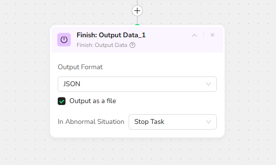 The Output Data Node is the final endpoint of your workflow. It collects and consolidates all data extracted during workflow execution from various Extract Data nodes, then exports everything in your chosen format.