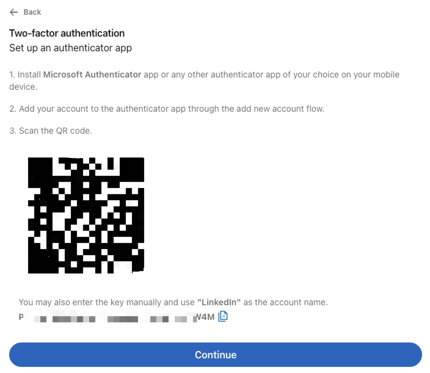 LinkedIn will generate a QR code and a secret key for your authenticator app.