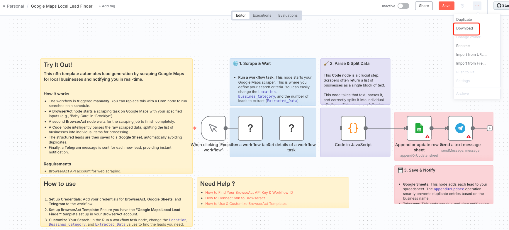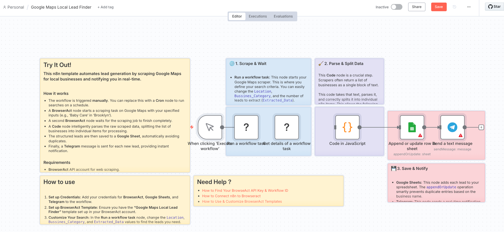 - Review before activating: Always check imported workflows thoroughly before running them in production