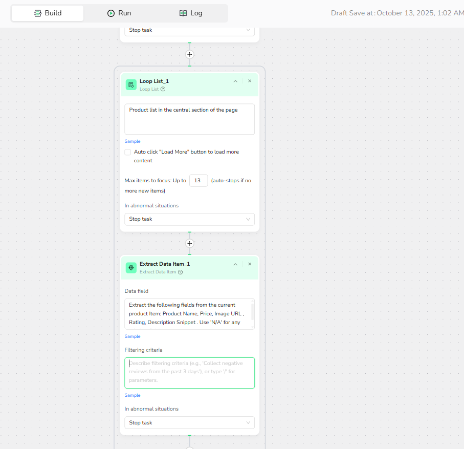 2.Add Extract Data Item: Prompt = "Extract the following fields from the current product Item: Product Name, Price, Image URL , Rating, Description Snippet . Use 'N/A' for any missing fields."
