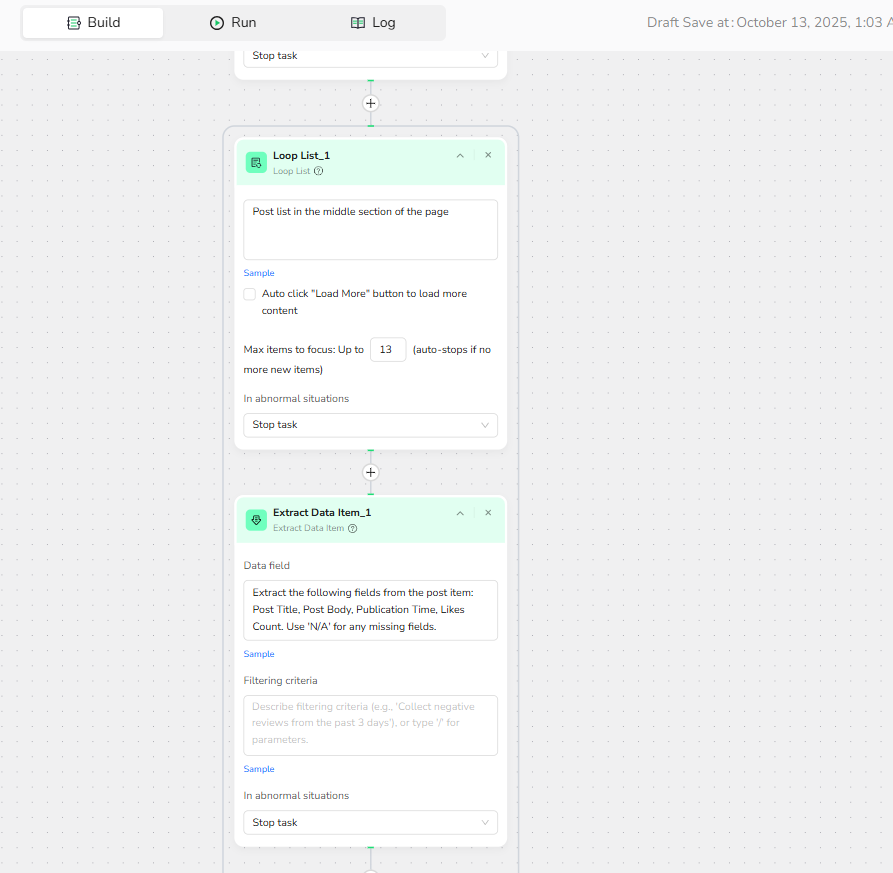 2.Add Extract Data Item: Prompt = "Extract the following fields from the post item: Post Title, Post Body, Publication Time, Likes Count. Use 'N/A' for any missing fields."