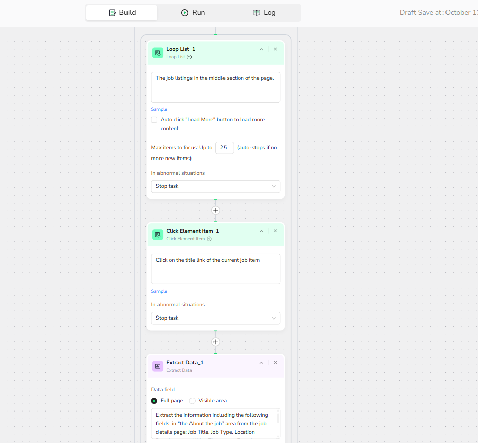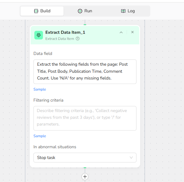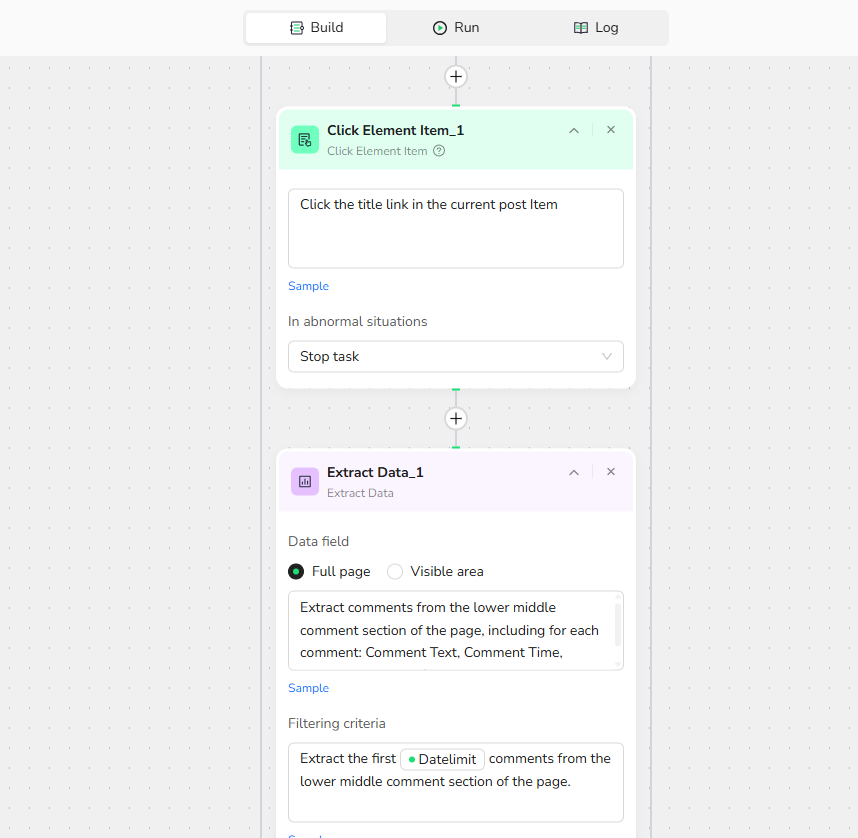 - When extracting different content from the same page, add two Extract Data nodes to extract content in stages, ensuring data accuracy (e.g., extract comments first, then other fields).