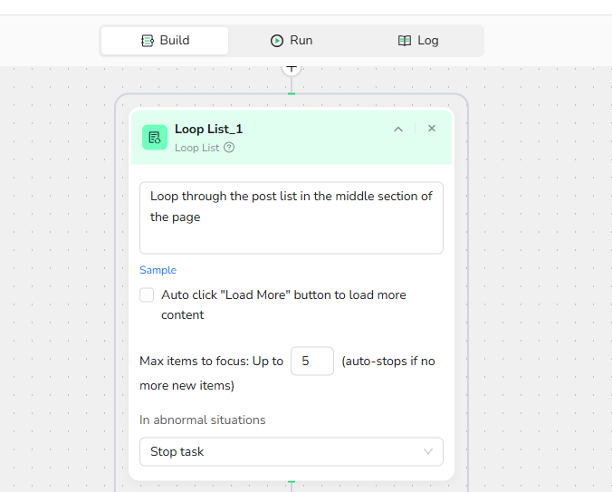 The Loop List node supports locating lists within the visible region and iterating through them, sequentially focusing on each Item and its detail page, with up to 3 levels of nested data extraction. When the maximum number of focused items is reached or no more new items are available, it stops executing nodes within the loop body and continues with subsequent nodes outside the loop. This node is particularly suitable for sequential data traversal and collection in automation workflows, enabling precise data extraction without manual intervention.