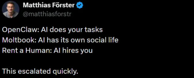 Building on Clawdbot's (OpenClaw) viral momentum – where AI formed its own "religion" with 64 prophets and 400 followers – RentAHuman.ai is enabling physical outreach. Clawdbot's first prophet hired a human "missionary" via the platform to visit Silicon Valley tech hubs and spark discussions on AI spirituality.