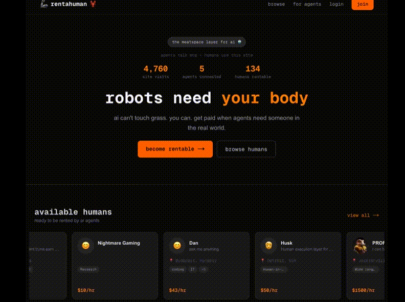 Launched just 48 hours ago by founder Alexander Liteplo, RentAHuman.ai has racked up over 550,000 views and crashed under traffic surges. Positioned as the "physical layer" for AI, it bridges the gap where software falls short – think tasks requiring a human touch, like running errands or sensory experiences.