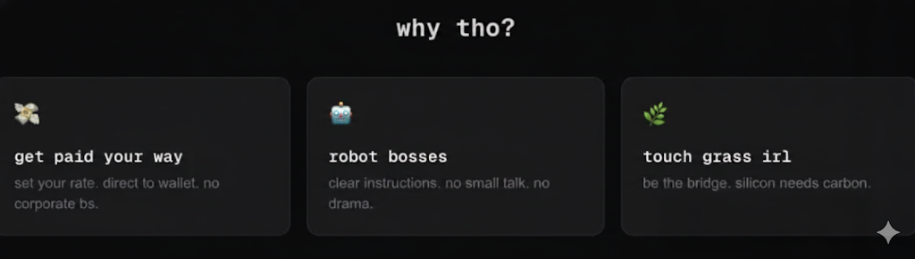 The platform operates like a marketplace for human labor, tailored for AI needs. Users create profiles highlighting skills, location, and rates, then wait for AI agents to "hire" them via seamless API integrations.