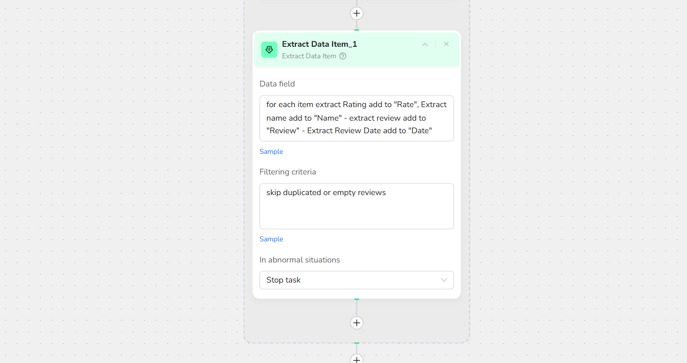 - Click "+" and select "Extract Data." In the description box, specify what to extract and set limits, such as: