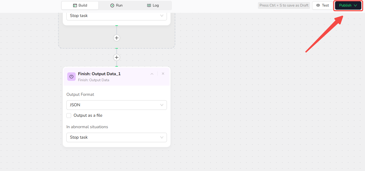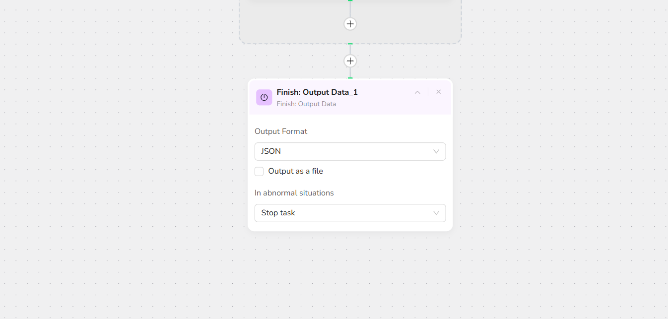 - Click "+" and select "Finish: Output Data." Choose CSV as the output format and enable "Output as a file" for easy downloading.