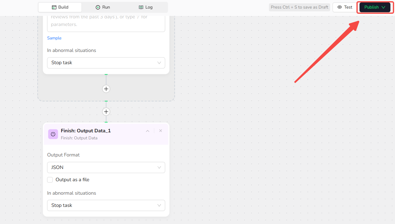 - Click "+" and select "Finish: Output Data." Choose CSV as the output format and enable "Output as a file" for easy downloading.