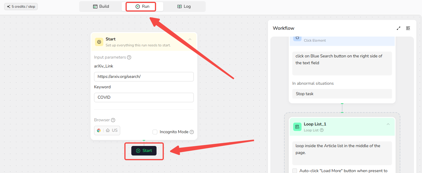 - Navigate to the "Run" section. Adjust parameters if Forbes (or use defaults), then click "Start" to execute the scrape.