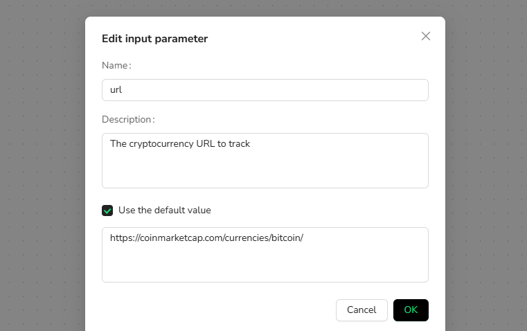 - Target_URL (e.g., "https://CoinMarketCap.com/currencies/bitcoin/")