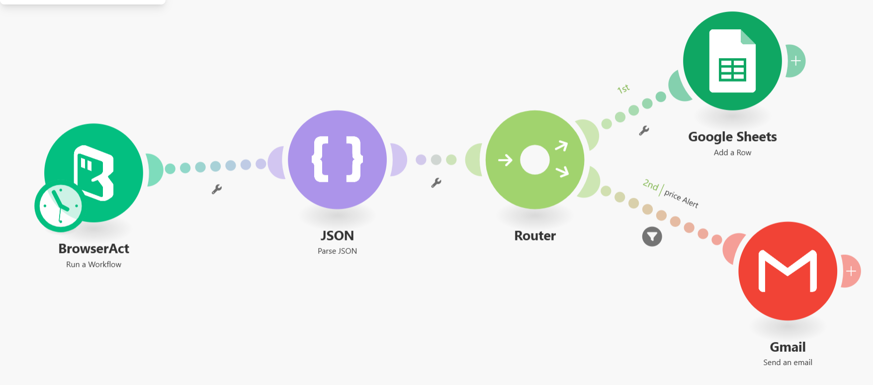 An automated cryptocurrency monitoring system that tracks prices, detects significant changes, stores historical data in Google Sheets, and sends alerts when price thresholds are reached—all running on autopilot via Make.com.
