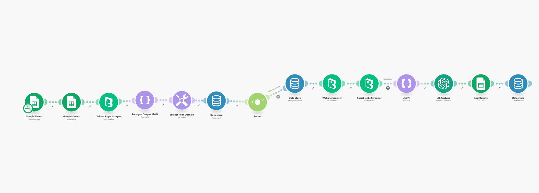 Create a complete business intelligence workflow by connecting Yellow Pages Scraper → Deep Website Scraper → Google Sheets: