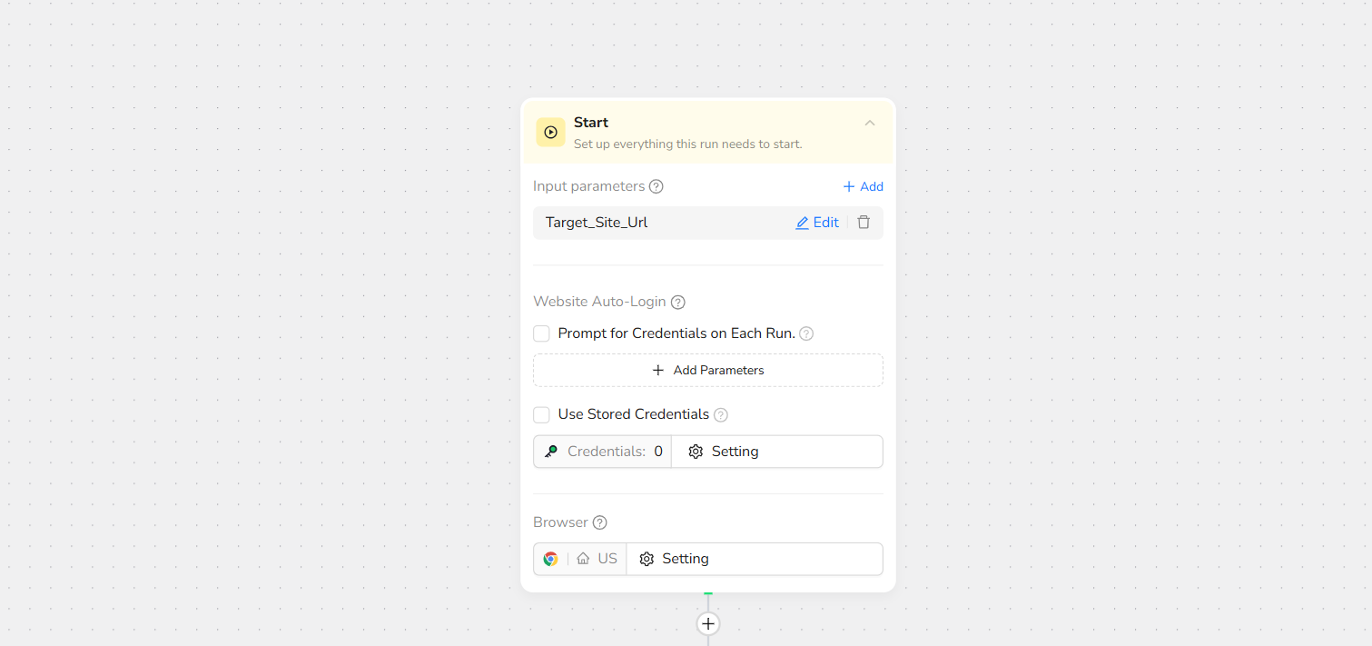 - Configure Parameters: Fill in necessary inputs like Target_url (e.g., "https://docs.google.com/spreadsheets/d/example/edit") – or use defaults to learn how to scrape Google Sheets quickly
