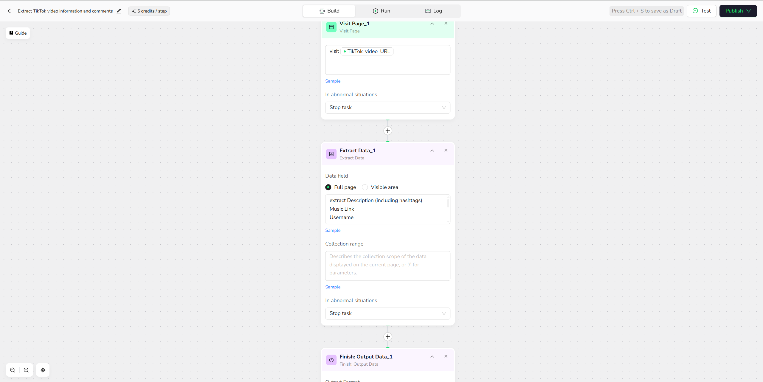 Extract all key information and comments from any TikTok video — including captions, hashtags, music links, profiles, and timestamps — all automatically, no coding required. Simply provide a TikTok video URL, and this prebuilt robot gathers the entire dataset within minutes.