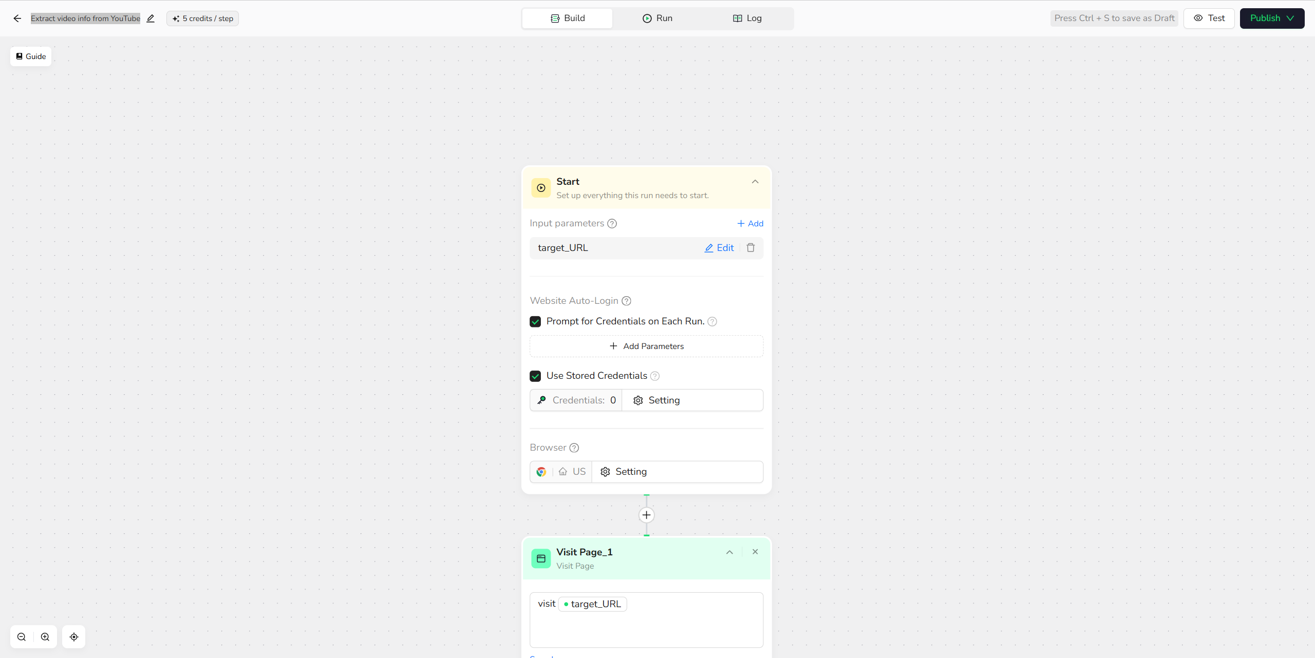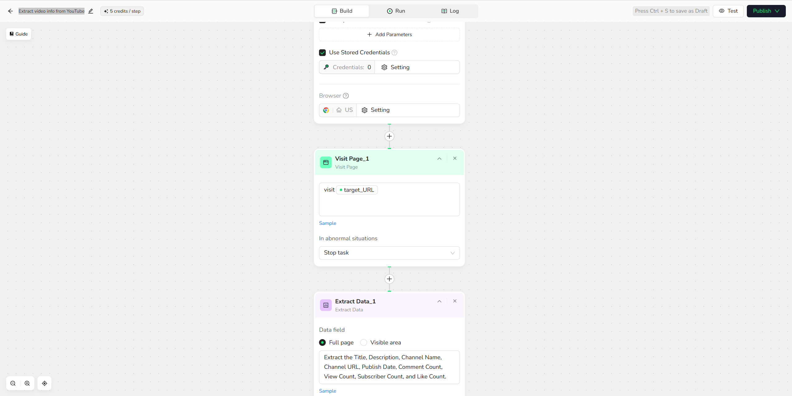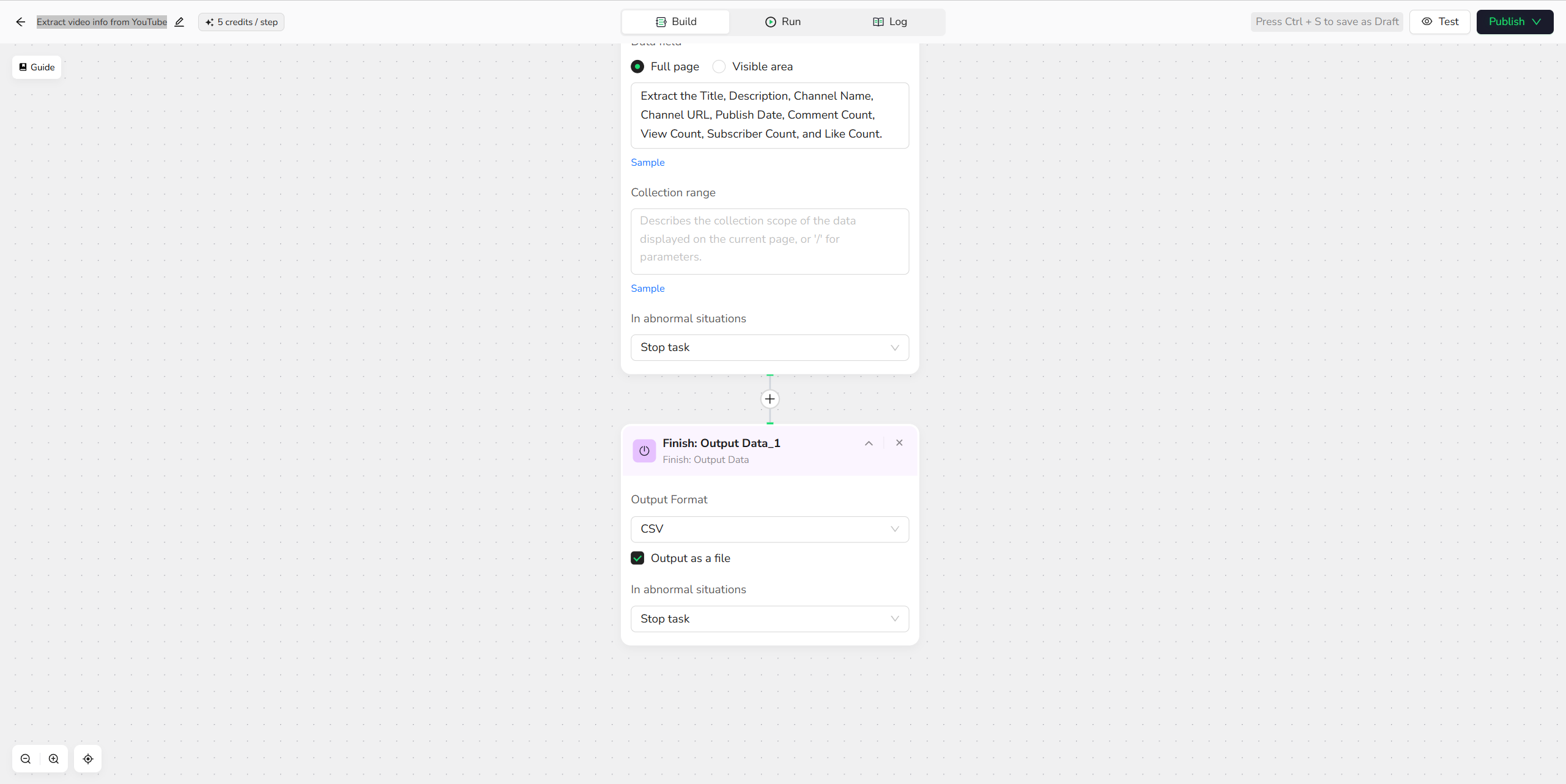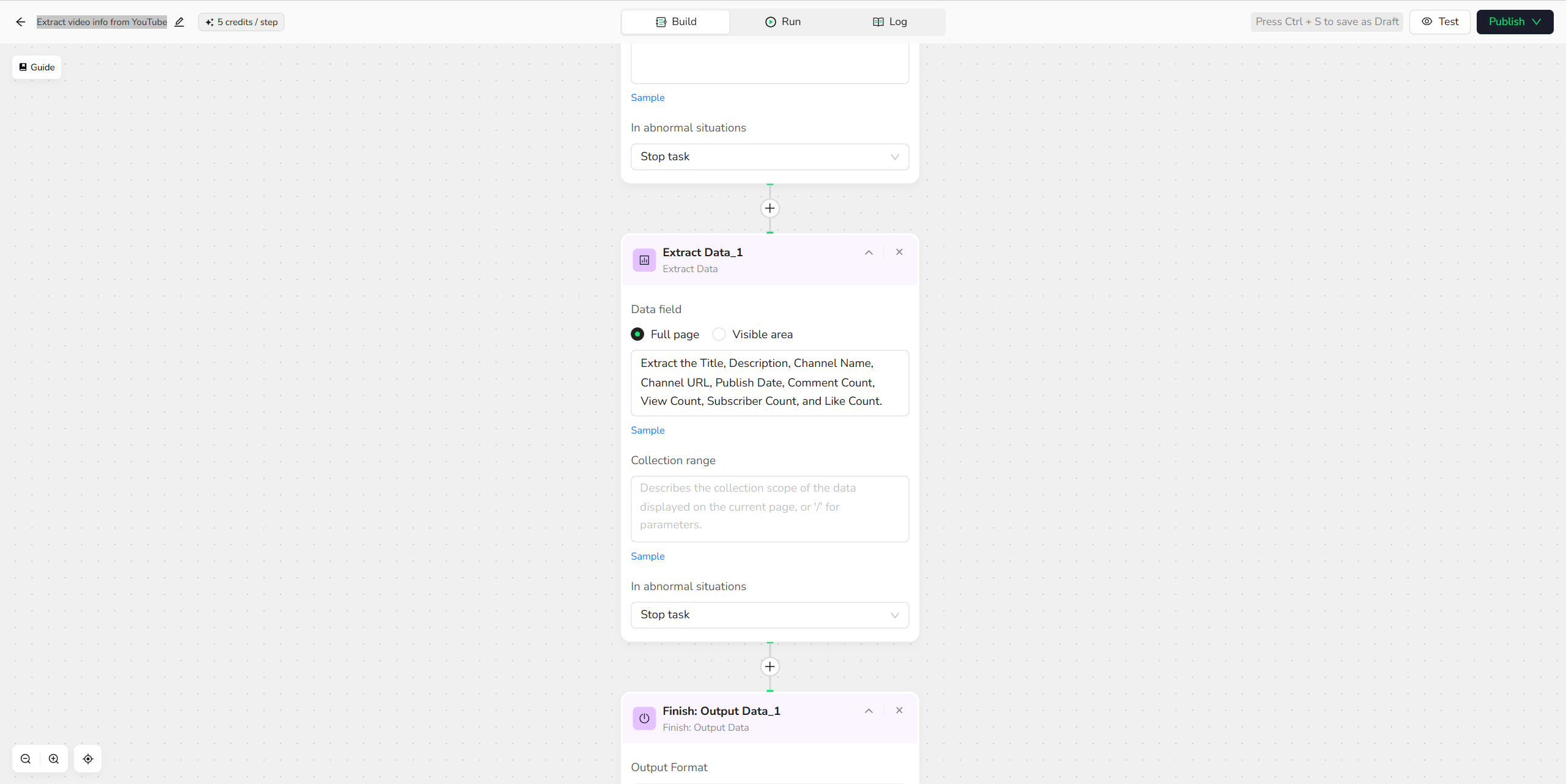 Extract Data – Gathers the following structured data: Title, Description, Channel Name, Channel URL, Publish Date, Comment Count, View Count, Subscriber Count, and Like Count.