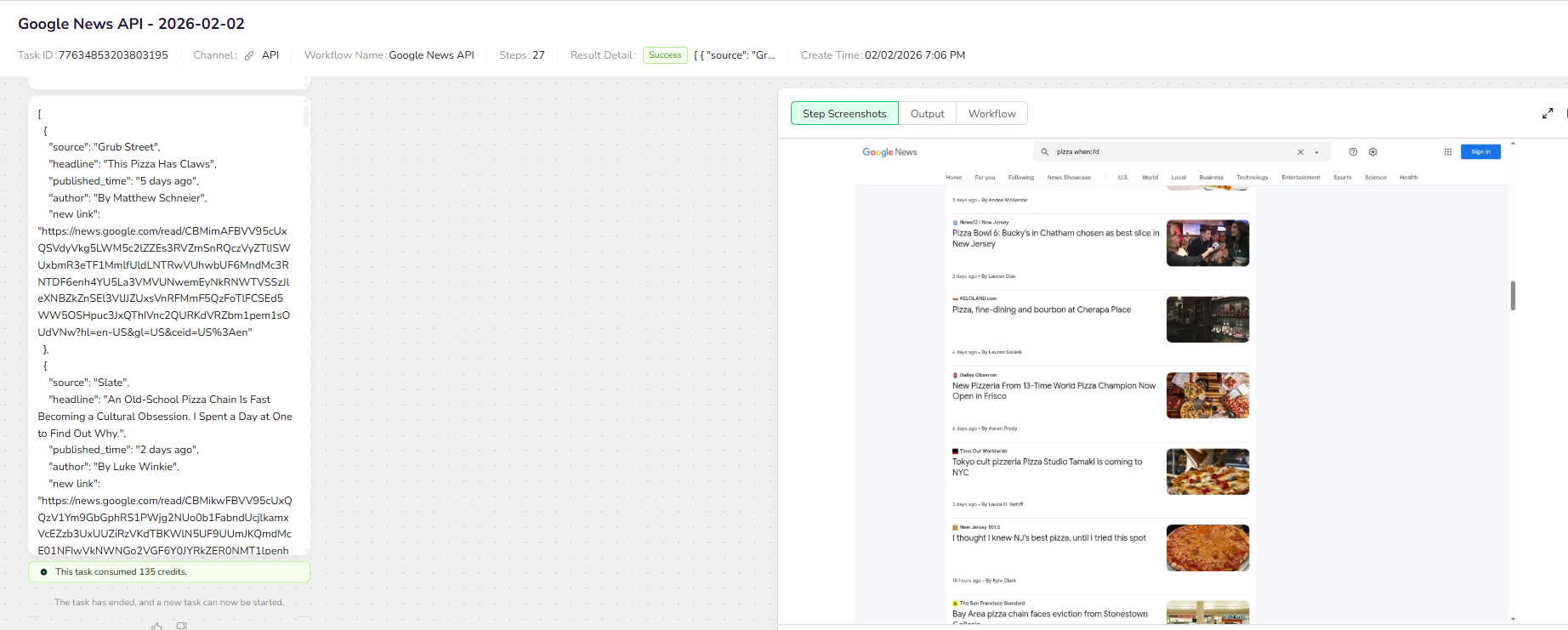 Once created, you can use the BrowserAct API to invoke your workflow programmatically and retrieve Google News directly in your application.