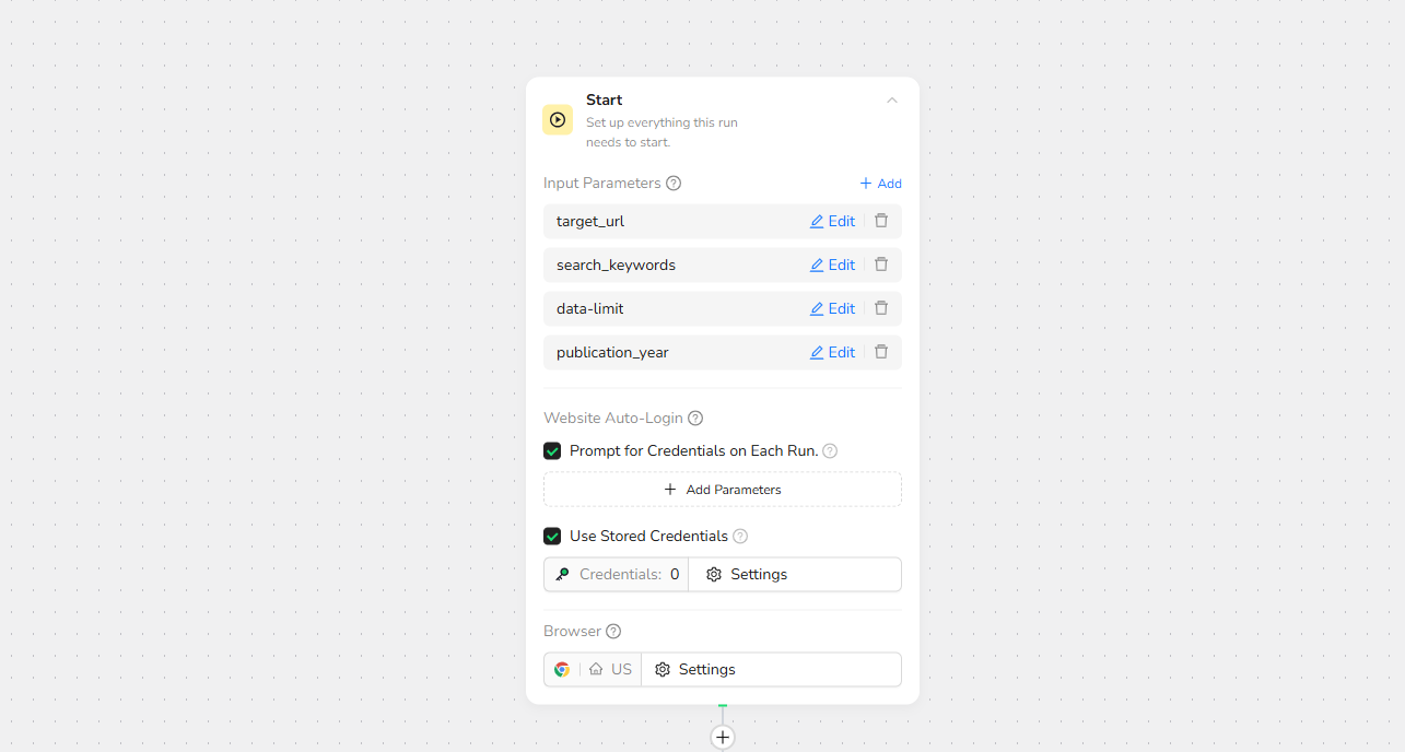 - Configure Parameters: Fill in necessary inputs like Target_url (e.g., "https://scholar.google.com/scholar?q=example") – or use defaults to learn how to scrape Google Scholar quickly