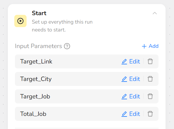 Add a "Loop" node and input the prompt: “Loop untill the iterations reach /Total_Job”. This sets up a loop to process the specified number of job listings.