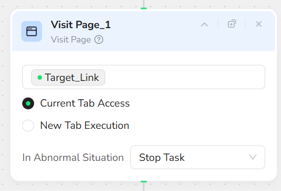 Add a "Visit Page" node and input the URL “/Target_Link”. This will navigate to the Indeed jobs page.