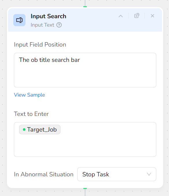 Add an "Input Text" node. In the Input Field Position, input “The ob title search bar”. In the Text to Enter, input “/Target_Job”.