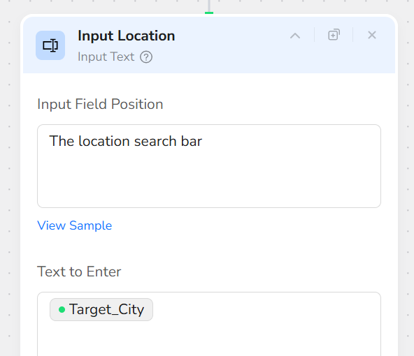 Add an "Input Text" node. In the Input Field Position, input “The location search bar”. In the Text to Enter, input “/Target_City”.