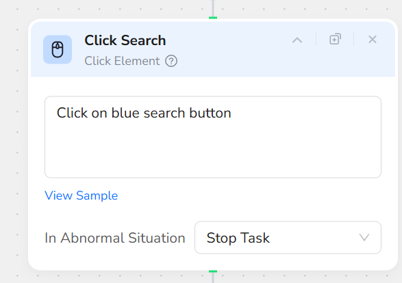 Add a "Click Element" node and input the prompt: “Click on blue search button”. This initiates the job search with the provided job title and location.