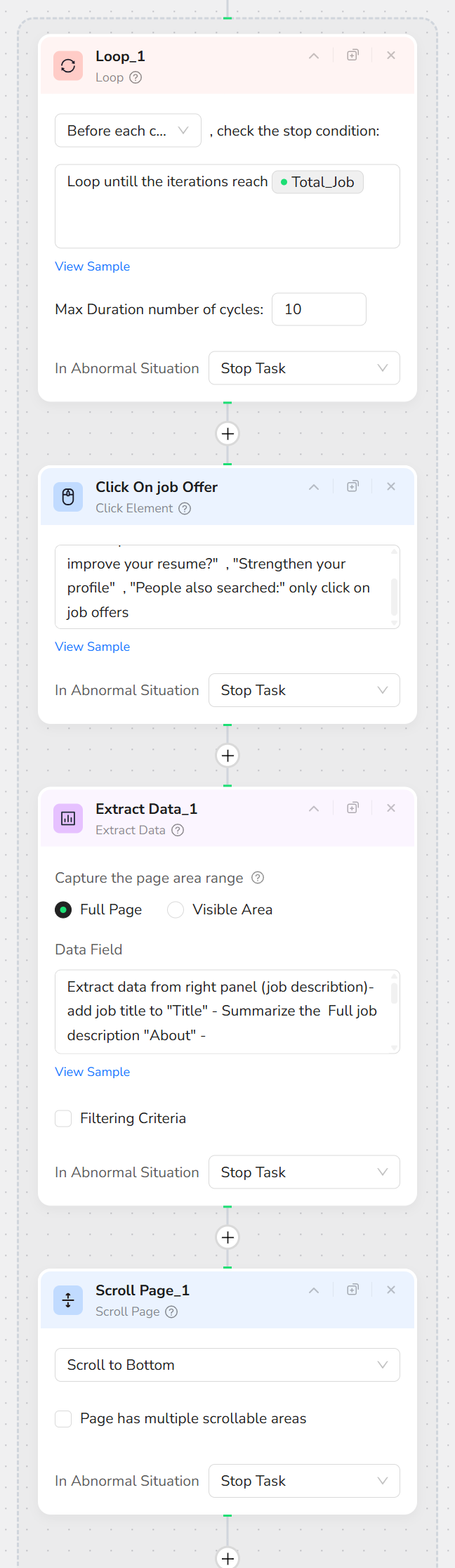 Inside the Loop node, add a "Scroll Page" node and select "Scroll to Bottom". This ensures the full job details are loaded in the right panel.