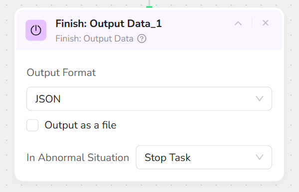 Add a "Finish: Output Data" node. Select "JSON" as the output format and check "Output as a file" for easy downloading. You can also choose to export in CSV, XML, or Markdown (MD) formats.