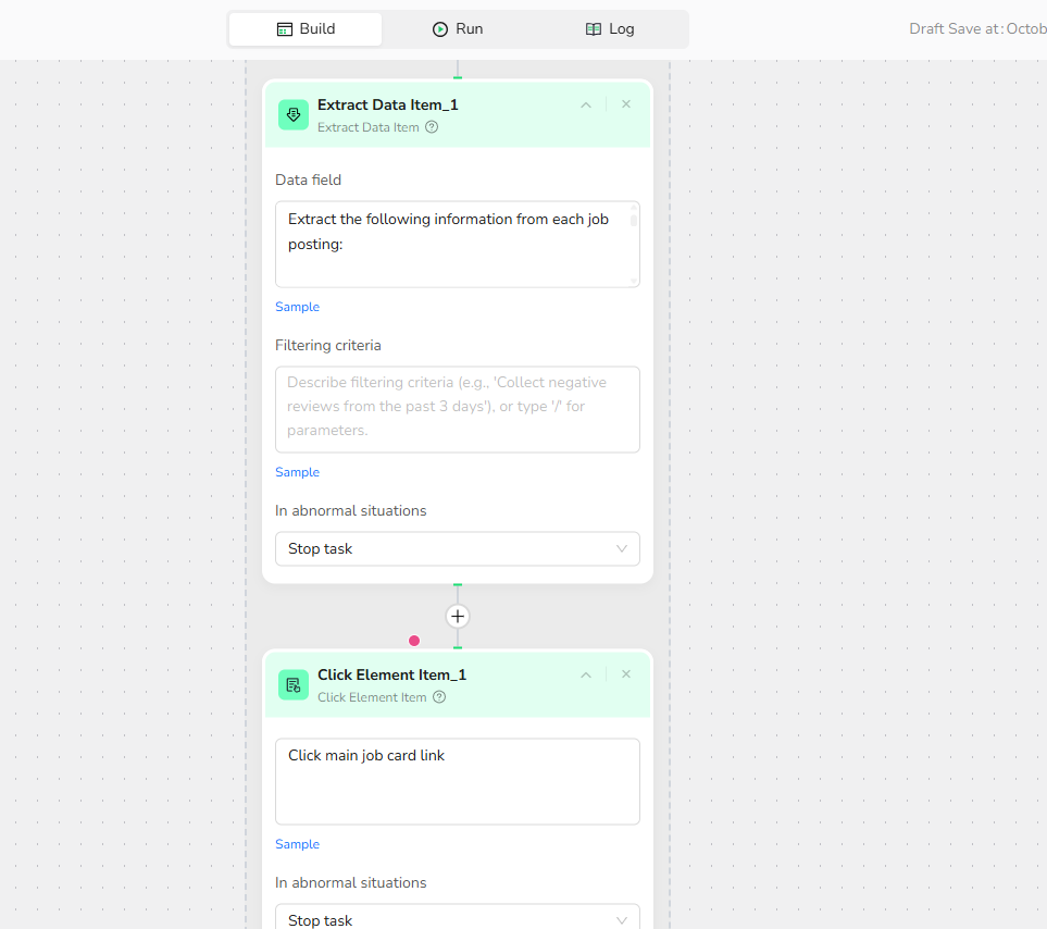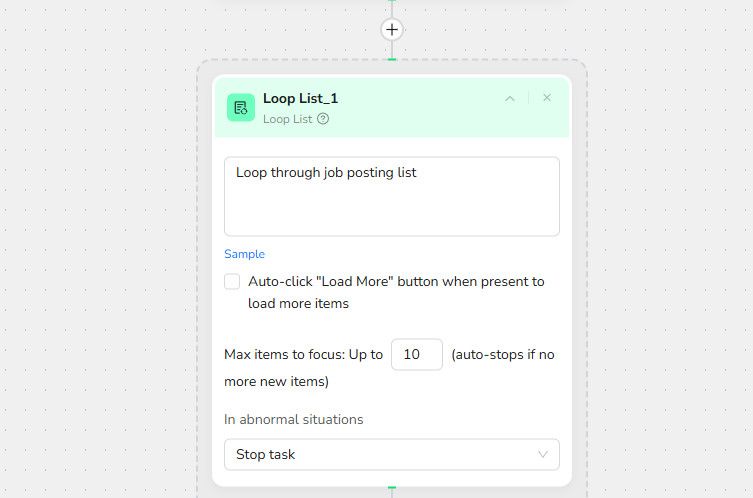 Note: The number of focused items represents how many job listings will be processed. Increase this value (e.g., 20, 50) to extract more jobs. The loop automatically stops when no new jobs are detected.