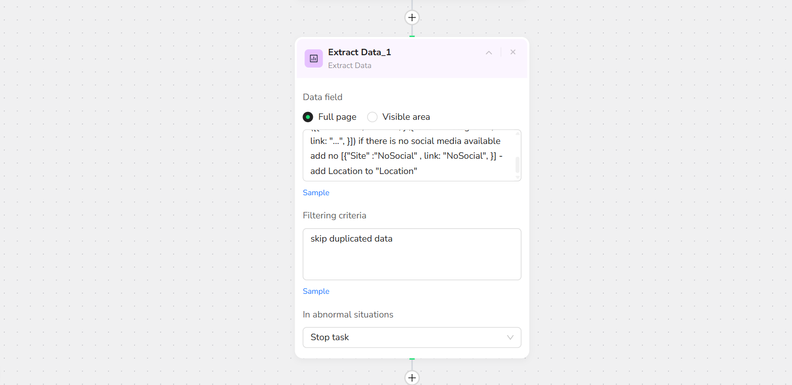 - Click "+" and select "Extract Data." In the description box, specify what to extract and set limits, such as: