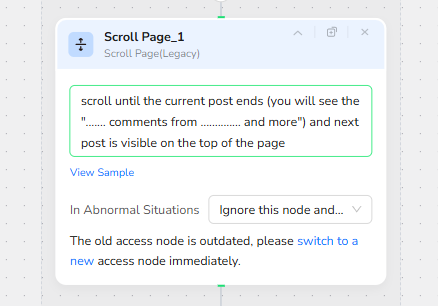 After extracting a post, this step scrolls until the current post ends. Your note references a specific UI marker like “... comments from … and more,” and requires the next post to be visible at the top of the page. This is a navigation tactic to ensure the loop progresses through the feed correctly.