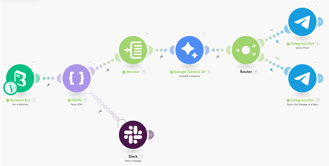 This Make.com scenario is responsible for orchestrating the data flow, AI processing, and message delivery after BrowserAct completes the scraping task.