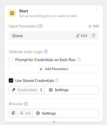The workflow begins by defining what the run needs in order to start successfully: an input parameter for the target site (Quora) and a login strategy using saved credentials. The goal is to enter Quora in an authenticated state so the home feed content can be loaded reliably.