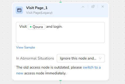It shows this is a legacy access node and suggests switching to the newer access node. If your run frequently breaks after Quora UI changes, switching to the newer access node is usually the first upgrade to do.