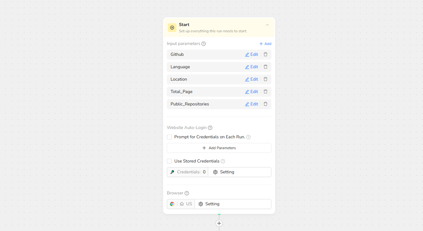 - Configure Parameters: Fill in necessary inputs like Target_url (e.g., "https://github.com/search?q=example") ā or use defaults to learn how to scrape GitHub quickly