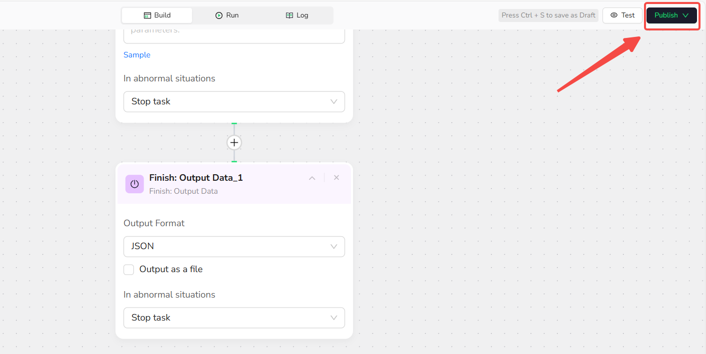 - Click "+" and select "Finish: Output Data." Choose CSV as the output format and enable "Output as a file" for easy downloading.