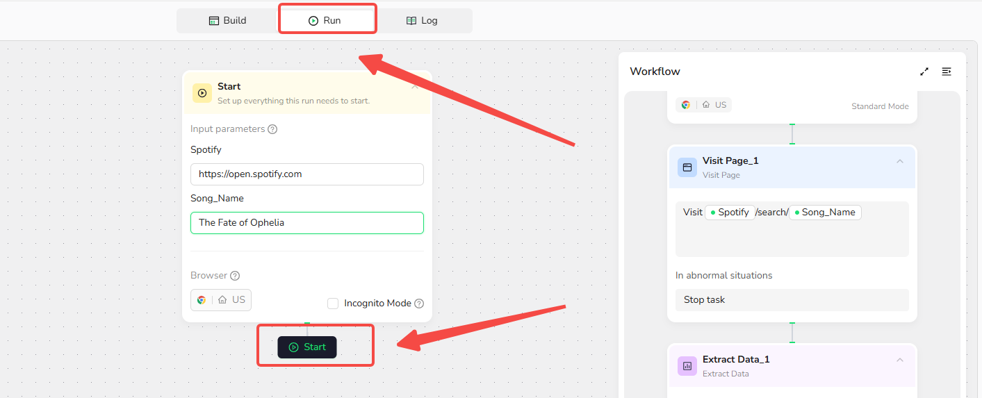 - Click the "+" icon to add actions. Start with "Visit Page" and enter "Visit /url" to direct the workflow to the specified URL, such as https://open.spotify.com. BrowserAct's AI will automatically understand the page structure, powering your Forbes web scraper without hassle.