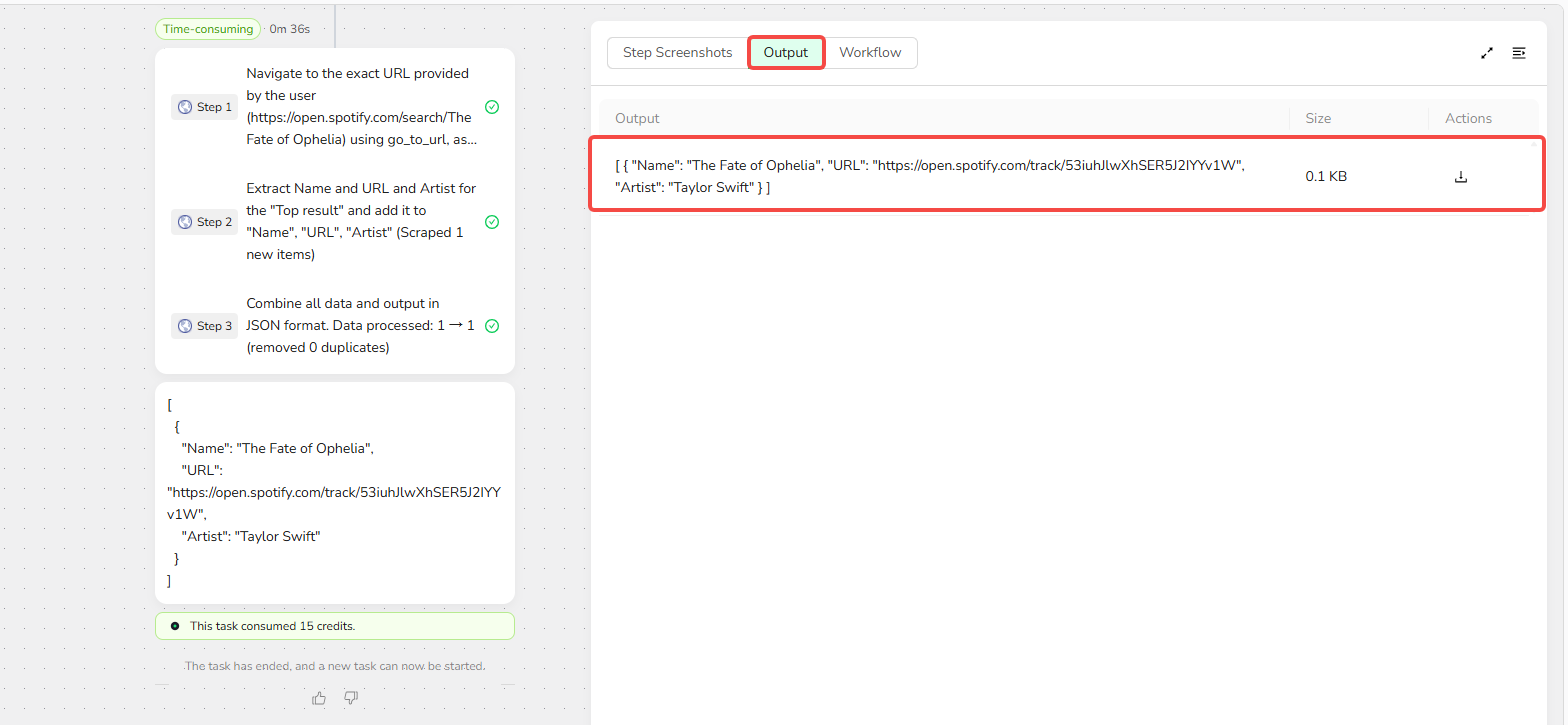 BrowserAct is a powerful automated data extraction tool that lets you easily scrape required data from any web page without programming knowledge. It can efficiently capture key Spotify music data, including song titles, artist info, play counts, user comments, album details, genres, and listener ratings. What can it do for you?