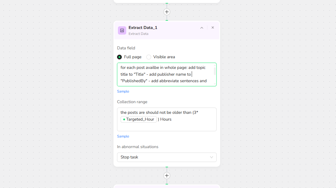 - Click "+" and select "Extract Data." In the description box, specify what to extract and set limits, such as: