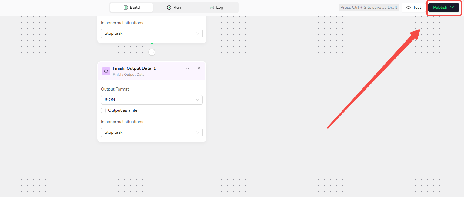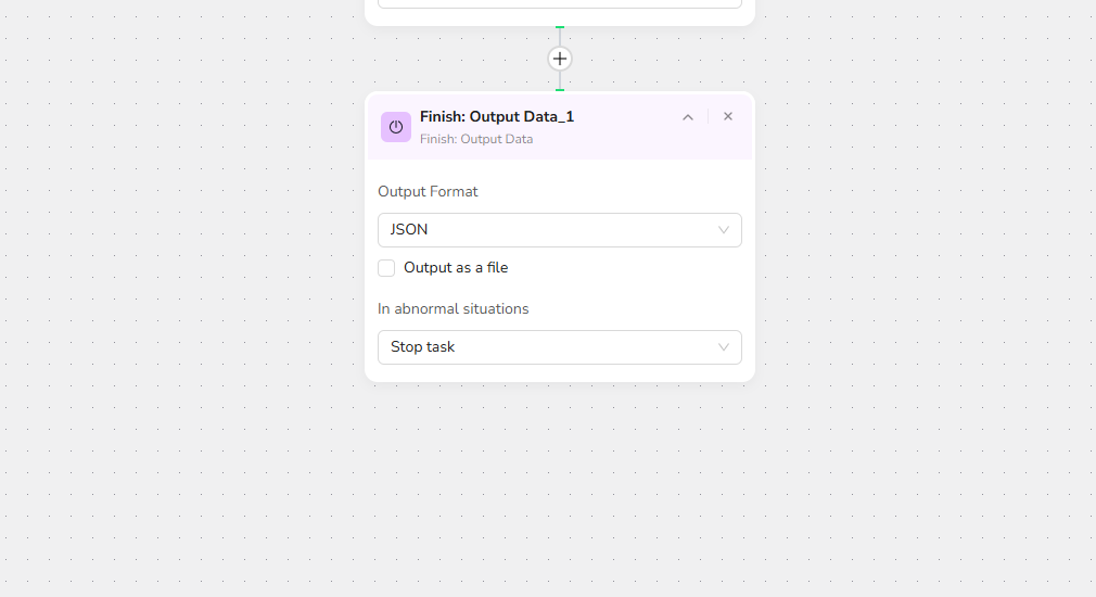 - Click "+" and select "Finish: Output Data." Choose CSV as the output format and enable "Output as a file" for easy downloading.