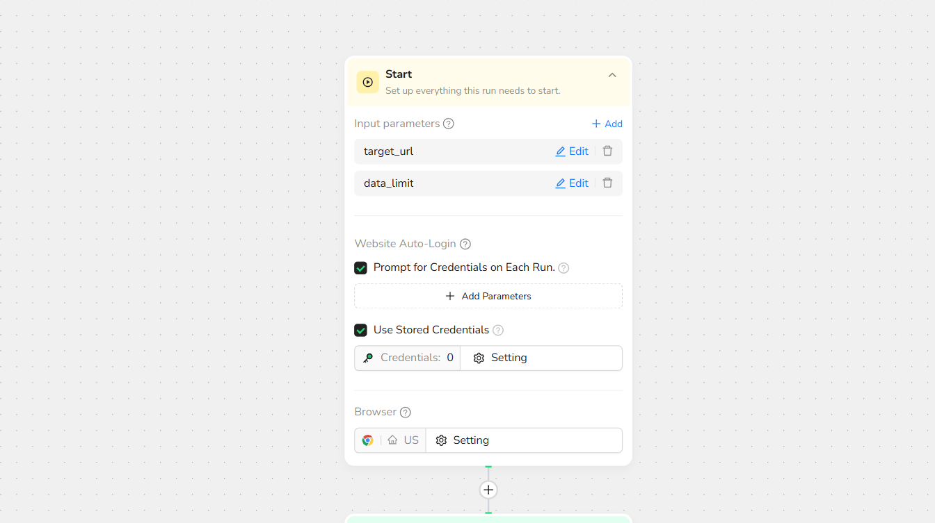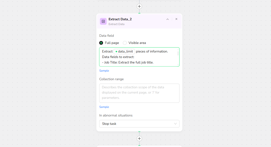 - Click "+" and select "Extract Data." In the description box, specify what to extract and set limits, such as: