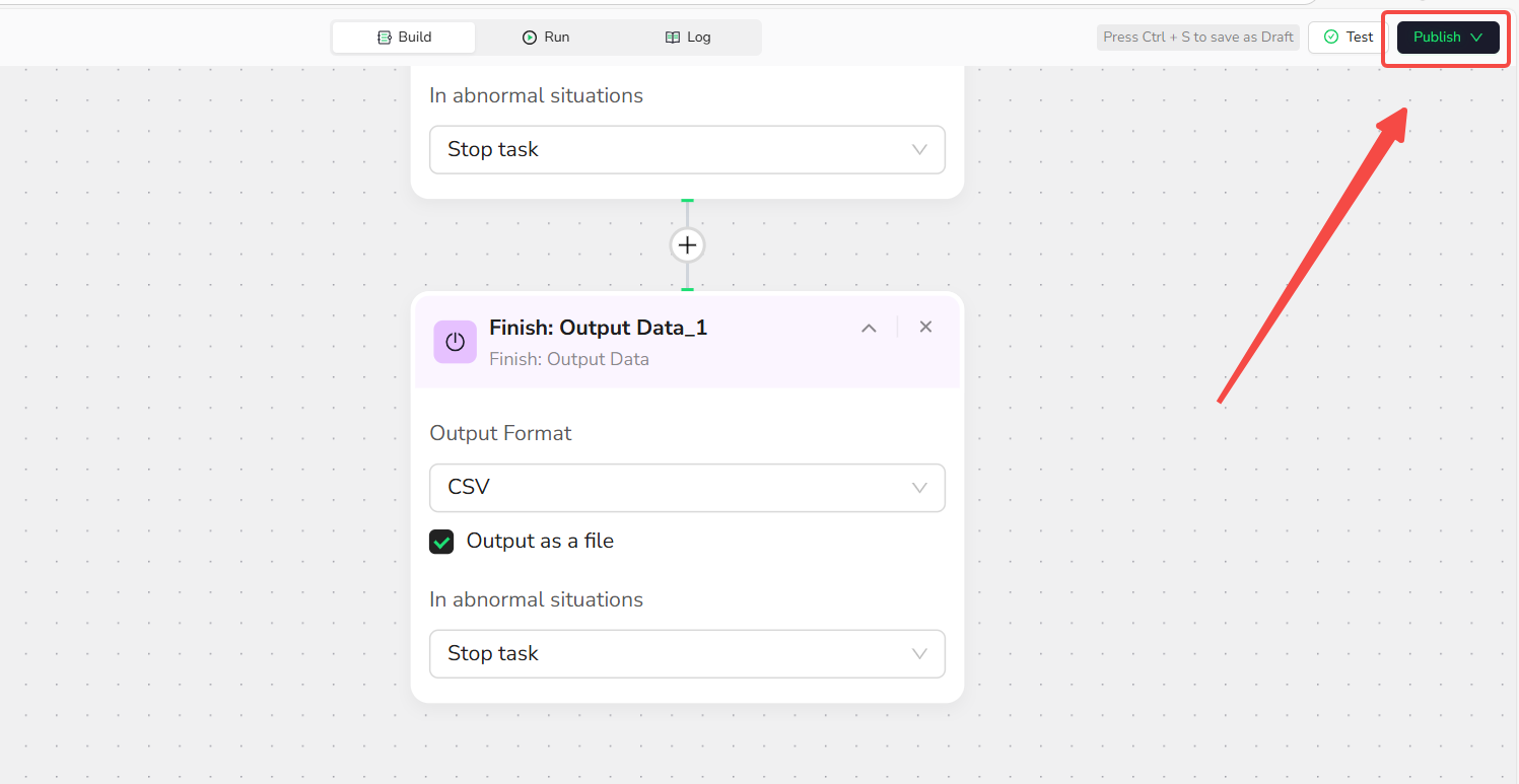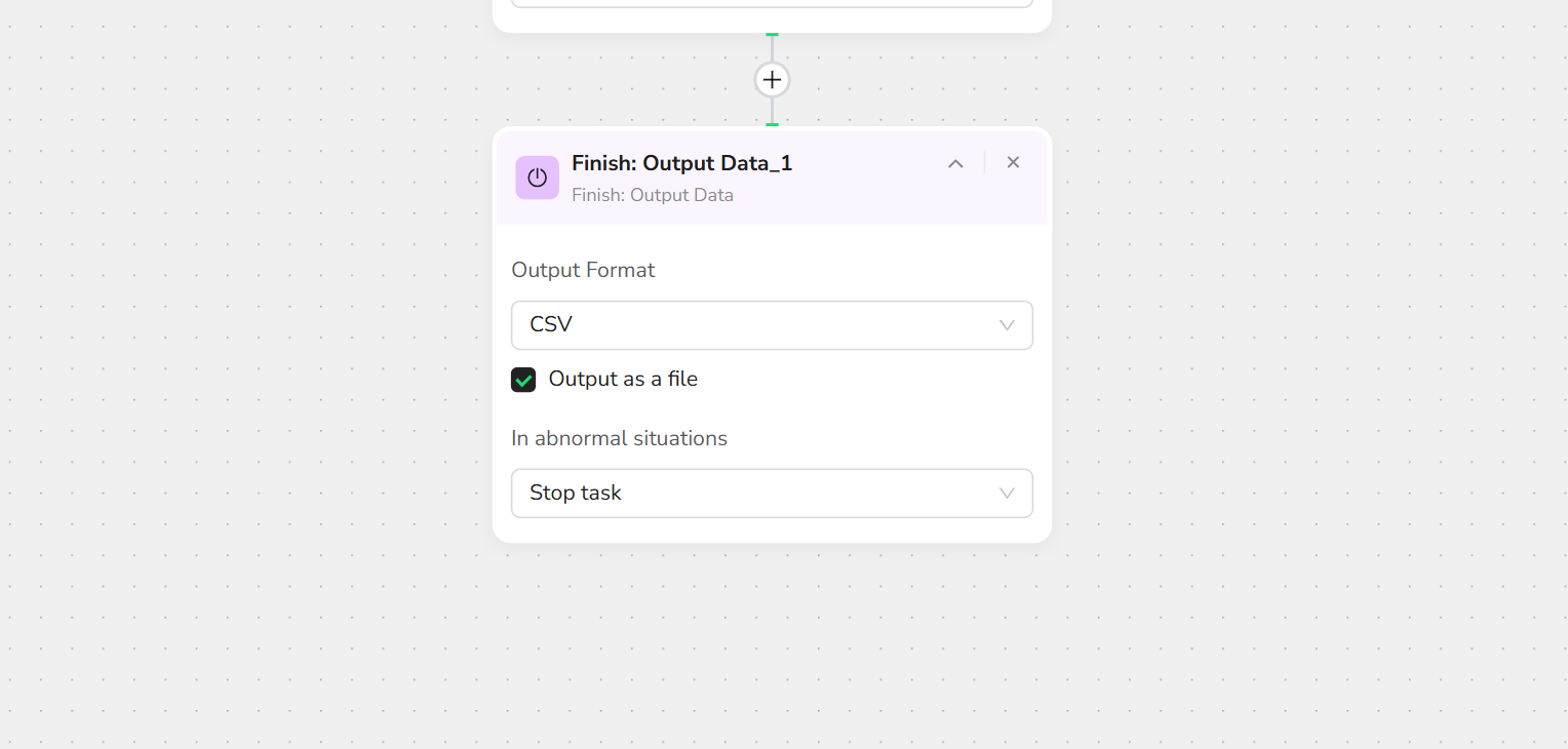 - Click "+" and select "Finish: Output Data." Choose CSV as the output format and enable "Output as a file" for easy downloading.