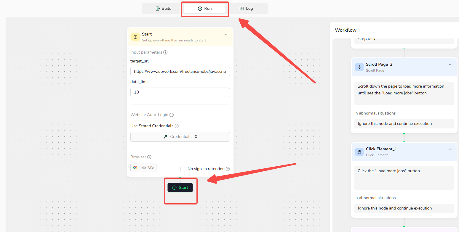 - Navigate to the "Run" section. Adjust parameters if Forbes (or use defaults), then click "Start" to execute the scrape.